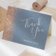 Este elegante cartões de agradecimentos de casamento moderno apresenta uma fronteira de brilho de pêssego num fundo azul empoeirado. O texto personalizável combina as palavras "Obrigado" em escrito branco e os nomes da noiva e do noivo em letra itálico.