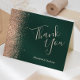 Este elegante cartões de agradecimentos de casamento moderno apresenta uma fronteira de brilho de pêssego em um fundo verde escura e esmeralda. O texto personalizável combina as palavras "Obrigado" no guião pálido de pêssego e os nomes da noiva e noiva em itálico.