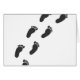 Um conjunto de pegadas sujas andando pela página em um fundo branco