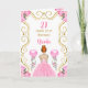 Este convite de aniversário apresenta um quadro elegante de ouro, uma bela princesa de cabelo vermelho e um vestido cor-de-rosa, flores e um balão.