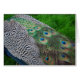 Fotografia original da parte traseira de um pavão, mostrando o começo da cauda, com as penas distintivas de verde lindo e do azul.