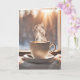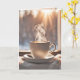 Uma xícara de café a vapor em um pires e mesa de madeira pela janela de inverno por pensar em você. O texto é editável.