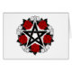 Pentagrama preto com padrão, decorado com floração, rosas vermelhas com folhas em fundo branco. Tatuagem.