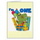 Pequenas T-shirts de primeiro aniversario Dino, fatos-chave, cartões, autocolantes, botões de aniversário, sacos de tota, guardas, e outros roupas de primeiro aniversario de dinossauro e presentes com um dinossauro sorridente verde com balões, chapéu de festa e um presente!