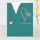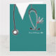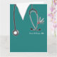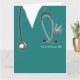 Cartão de graduação de uma escola médica criativa com esfregões hospitalares com uma faca suíça no bolso. Para personalizar, edite texto para adicionar o nome do médico.
