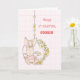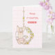 O fundo cor-de-rosa suave tem um padrão sutil. Um coelho querido está vestindo uma camisa listrada rosa, balançando sobre uma coroa. Cartão perfeito para mandar a qualquer garotinha na primeira Páscoa! Personalize com o nome dela!