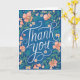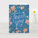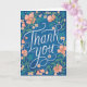 A ilustração original e a inscrição de Becky Nimoy "Obrigado" em branco cursivo sobre azul com flores de pêssego.