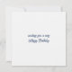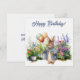 Peter o coelho na sua jaqueta azul com balões coloridos no seu jardim floral com uma cerca branca de piquete desejando-lhe uma saudação feliz de aniversário