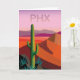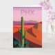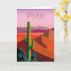 This design is a contemporary poster with a simple graphic expression of desert landscape in warm red, pink and purple with saguaro cactus in foreground. Text abbreviation "PHX" appears at top of poster and "Arizona" in small white type at bottom.