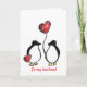Cartão de Natal de marido fofo personalizado com dois pinguins ilustrados segurando um balão vermelho em forma de coração. Este cartão moderno e romântico é perfeito para uma esposa dar ao seu cônjuge durante o período de férias. A mensagem e a inicial no cartão podem ser personalizadas conforme desejado.