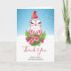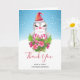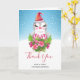 Cartões de agradecimentos com um design bonito e caprichoso com um adorável pinguim vestindo um chapéu de santa vermelho. Ficando atrás de um buquê de flores com canas doces listradas cor-de-rosa e branca. Um fundo de inverno nevado com flocos de neve caindo.