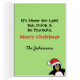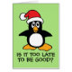 É tarde demais para ser bom? Um pinguim de Natal bonito com um chapéu de Papai Noel para as Férias de Natal. Diversão e design de bobo com um ditado engraçado que pode ser personalizado. A dentro do cartão diz: "Nunca é tarde demais. Coma, beba e seja grato. Feliz Natal" e está pronto para você adicionar qualquer nome ou sobrenome da sua família. Slogan do Humor de Natal, citação de Natal, feriado engraçado dizendo, citação de Natal fofa.