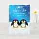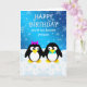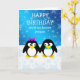 Dois pinguins brancos e pretos bonitos de mãos dadas num dia de neve de inverno. Na frente e dentro do cartão estão modelos que você pode usar para personalizar este cartão de aniversário fofo.