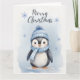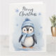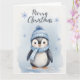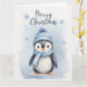 Uma encantadora ilustração de inverno de um adorável pequeno pinguim vestindo um chapéu e cachecol listrados de azul, trazendo um clima aconchegante e festivo. Os flocos de neve macios e tons azuis suaves no fundo criam uma atmosfera mágica de inverno. Perfeito para cartões de Natal, pôsteres, adesivos e artesanatos sazonais!