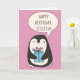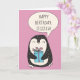 Envie alguns cartões de aniversários personalizados com este cartão de aniversário feliz para o pinguim. Ele apresenta uma ilustração de pinguim bonitinho segurando um presente embrulhado contra um fundo rosa. Use os campos modelo para criar facilmente sua própria mensagem personalizada na frente e no dentro desta placa.