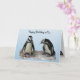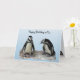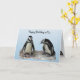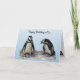 Este cartão de aniversário apresenta dois adoráveis Pinguins Africanos em pé em uma borda rochosa. São aves aquáticas, sem voo, cujas asas se tornaram nadadeiras. Cada um tem uma faixa preta e pontos pretos no peito. O padrão das manchas é único para cada pinguim, assim como as digitais humanas. Eles têm glândulas cor-de-rosa sobre os olhos e pés rosas e pretos. Mais dois pinguins pequenos são dentro. O texto pode ser personalizado para sua ocasião especial.