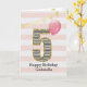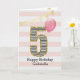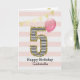A pink and gold 5th birthday card for girls, which you can personalize with her name. The front of this beautiful 5th birthday card for her features the number five in a black and white stripe with an outline of glitter with a pink balloon ready to float way. Please note the gold glitter is a design effect and no actual glitter will be on this birthday card. The background is a soft white and pink with a gold bunting banner at the top.The inside message can be easily personalized if you wanted. A pretty 5th birthday card keepsake for her.