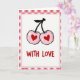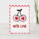 This Valentine's Day card shows two pink cherries side by side, each with a red heart shape in the center where the pit would be. The cherries look sweet and friendly, with small light spots that make them seem shiny. A thin black stem connects them at the top, making them feel like a close pair. The background is white, so the simple shapes and colors stand out clearly. Around the edges, there’s a pink-and-white gingham border that gives the card a cozy, homey frame. Under the cherries, the words “WITH LOVE” appear in red cursive-style lettering, centered near the bottom. Overall, it feels like a small, warm message of affection that fits a romantic or friendly note