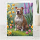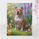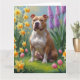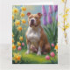Um cão alegre senta-se pacificamente em relva verde exuberante, rodeado por flores coloridas da primavera sob um céu azul suave. Esta pintura digital a óleo captura um momento sereno com pinceladas expressivas, cores quentes e uma sensação de alegria suave.