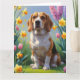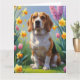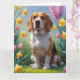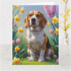 Um cão alegre senta-se pacificamente em grama verde exuberante, rodeado por flores coloridas da primavera sob um céu azul suave. Esta pintura digital a óleo captura um momento sereno com pinceladas expressivas, cores quentes e uma sensação de alegria suave.