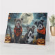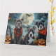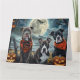 Libere o espírito assustador com esta design sombria do Dia das Bruxas apresentando um bando de cachorros sob um céu escuro e iluminado, cercado por morcegos voadores e abóboras brilhantes. Perfeito para aqueles que amam um toque de diversão terrível com seus amigos peludos!