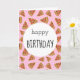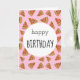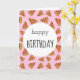 Este cartão de aniversário contém as palavras "Feliz Aniversário" na frente, com fatias de pizza sobre fundo de rosa claro. O dentro diz: "Espero que seu dia especial esteja cheio de todas as coisas que você ama. Feliz aniversário!"