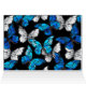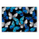 Borboletas realistas, azuis e brancas têm um padrão uniforme em fundo preto.