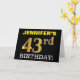 Este design de cartão de saudação de aniversário apresenta uma mensagem como "43º ANIVERSÁRIO DE JENNIFER!", com o "43º" a ter uma aparência falsa e imitada de cor dourada. O nome do destinatário na frente pode ser personalizado e o fundo frontal é preto colorido. Também apresenta uma mensagem de saudação de aniversário personalizável no dentro. Um cartão de aniversário como este talvez pudesse ser dado a alguém para celebrar o seu quarenta e terceiro aniversário. [~Z0000183]