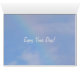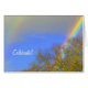 O arco-íris brilhante à direita tem uma cópia pálida à esquerda. A luz solar melhora os membros da árvore no fundo da imagem. O texto do cobrir "Celebrar" e o texto interior "Aproveite o seu dia!" podem ser personalizados. O interior tem arco e nuvens do arco-íris esmaecidos no céu azul como fundo.