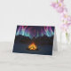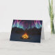 Em um vale coberto de neve em uma noite gelada no morto do inverno uma fogueira salta para cima para espelhar as luzes do norte enchendo o céu acima das montanhas distantes.