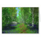 Um caminho supercrescido que percorre a floresta de pássaros em um dia ensolarado de verão. À sombra das árvores aglomeram tapetes de campainhas em tons de azul e roxo contrastando com a primavera verde da grama e pássaros.