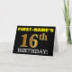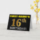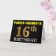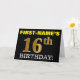 Este design de cartão de saudação de aniversário apresenta uma mensagem como "PRIMEIRO NOME DO 16º ANIVERSÁRIO!", com o "16º" a ter uma aparência falsa e imitada de cor dourada. O nome do destinatário na frente pode ser personalizado e o fundo frontal é preto colorido. Também apresenta uma mensagem de saudação de aniversário personalizável no dentro. Um cartão de aniversário como este poderia talvez ser dado a alguém em comemoração do seu décimo sexto aniversário. [~Z0000183]