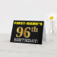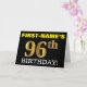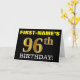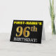 Este design de cartão de saudação de aniversário apresenta uma mensagem como "FIRST-NAME'S 96th BIRTHDAY!", com o "96º" a ter uma aparência falsa e imitada de cor dourada. O nome do destinatário na frente pode ser personalizado e o fundo frontal é preto colorido. Também apresenta uma mensagem de saudação de aniversário personalizada no dentro. Um cartão de aniversário como este talvez pudesse ser dado a alguém em comemoração do seu nonagésimo sexto aniversário. [~Z0000183]