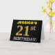 Este design de cartão de saudação de aniversário apresenta uma mensagem como "aniversário de 21 anos de JESSICA!", com as "21ruas" a terem uma aparência falsa e imitada de cor dourada. O nome do destinatário na frente pode ser personalizado e o fundo frontal é preto colorido. Também apresenta uma mensagem de saudação de aniversário personalizada no dentro. Um cartão de aniversário como este talvez pudesse ser dado a alguém em comemoração do seu vigésimo primeiro aniversário. [~Z0000183]