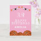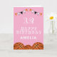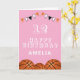 Placa de Aniversário de criança de Bola de Basquete. O design tem bolas de basquete e bandeiras de festa de aniversário em cor laranja, preta e branca em fundo rosa. Adicione seu nome, idade e texto e faça seu próprio cartão de aniversário. Excelente para rapazes e raparigas que adoram basquete.
