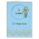 Ouro bonito e Iris, cartão de chá de panela. O design é um círculo de fita azul com algumas íris do lado, sobre um fundo azul. A parte inferior da placa tem uma fileira de cupcakes azuis e azuis bonito. Obrigados para cortes de Design e Hungryjpeg para alguns dos elementos do design.