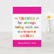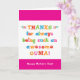 Você chama sua avó Ouma, não vovó. (Ouma significa avó em africânder.) Imagine como a Ouma ficará animada em receber um cartão de Dia de as mães endereçado especialmente a ela! Sua mãe também vai adorar a divertida e colorida design com base em texto que diz "Obrigados por ser sempre uma Ouma incrível! Feliz Dia de as mães!" Torne este cartão personalizável! Clique em "Editar Design", "Dentro Inferior/Direita: Texto e imagens", "Texto" e "Adicionar texto" para escrever a sua própria mensagem personalizada e personalizada no dentro de Ouma!