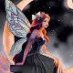 Aquarela e fada sentadas numa rocha no céu noturno da lua. Asas borboletas, fada de cabelo vermelho, design de aquarela. Dentro tem uma boa mensagem para o aniversário da menina, mas esta carta pode ser usada para qualquer celebração. Ambos os lados da dentro são o céu noturno com nuvens e efeito de brilho.