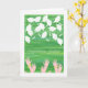 O design tem mãos jogando bonés de formatura no ar. Os bonés são brancos e o fundo é pintado de verde.