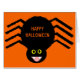 Esta grande carta de saudação apresenta uma aranha preta assustadora com oito pernas peludas, olhos amarelos com grandes pupilas pretas e sua boca aberta mostrando suas presas. Este cartão assustador de Halloween tem um fundo laranja.