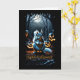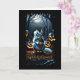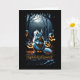 Este cartão de Dia das Bruxas apresenta uma cena única e caprichosa perfeita para aqueles que desfrutam de um toque natural nas suas festividades de férias. O ponto focal é um esquilo animado, levemente estranho, iluminado pela luz pálida de uma lua de cheio. O esquilo está confiante no centro, com o pelo brilhando levemente à luz da lua, criando um efeito mágico, mas assustador. Ao redor do esquilo estão várias lanternas-de-jack, cada uma gravada com expressões clássicas e maliciosas que acrescentam ao espírito do Halloween. O fundo apresenta uma floresta escura e sombria, com árvores torcidas e sem folhas que melhoram a atmosfera sombria da noite.