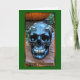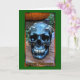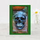 Este cartão de Dia das Bruxas apresenta uma design escura e sombria que certamente apelará aos fãs da macabra. A imagem central é um crânio preto detalhado com acabamento brilhante, quase metálico. O crânio é enfeitado com ossos pequenos e delicados e fendas recheados de uma substância dourada, dando-lhe uma aparência única e antiga. O cenário parece ser uma cena rustica ao ar livre, com o crânio a repousar sobre uma superfície de madeira, acrescentando ao design um toque de textura natural crua.