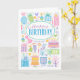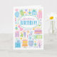 Um cartão feminino pastel brilhante para aniversário de 21 anos de cada aniversário e festa relacionada a ela. Bolos, presentes, balão, flores e chapéus de festa enchem o cartão e também formam a fronteira inferior no dentro do cartão.