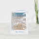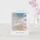 Aniversário de casamento com corações de praia e areia com surf de oceano e vista de janela aberta. O texto pode ser editado ou excluído.