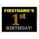 Este design de cartão de saudação de aniversário apresenta uma mensagem como "primeiro aniversario do FIRSTNAME!", com as "1ruas" a terem uma aparência de cor falsa/imitada em ouro. O nome do destinatário na frente pode ser personalizado e o fundo frontal é preto colorido. Também apresenta uma mensagem de saudação de aniversário personalizável no dentro. Um cartão de aniversário como este talvez pudesse ser dado a alguém em comemoração do seu primeiro aniversário. [~Z0000183]