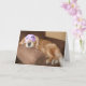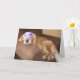 Conhece alguém que está reformado? Envie-lhes um grande parabéns! Este cartão apresenta uma fotografia de um cão que recupera um ouro giro dormindo numa cadeira marrom, enquanto veste uma máscara de sono roxa com pestanas pretas. O texto do dentro diz: "Parabéns pela sua aposentadoria!" Texto totalmente personalizável. Altere as palavras, o estilo, o tamanho da fonte - ou remova totalmente para um cartão de vazio.