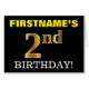 Este design de cartão de saudação de aniversário apresenta uma mensagem como "segundo aniversário do FIRSTNAME!", com o "segundo" a ter uma aparência falsa/de cor dourada. O nome do destinatário na frente pode ser personalizado e o fundo frontal é preto colorido. Também apresenta uma mensagem de saudação de aniversário personalizável no dentro. Um cartão de aniversário como este talvez pudesse ser dado a alguém em comemoração do seu segundo aniversário. [~Z0000183]
