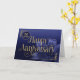 Este é um cartão de 50 anos de Funcionário com o texto 'Feliz Aniversário' escrito em uma fonte elegante com traços fluidos. O texto e os detalhes do design têm uma capa de efeito de folha de ouro atraente. O fundo consiste de um médio a um gradiente azul escuro, com uma flor lírio que pega os olhos, em tons de azul correspondentes, no canto inferior direito. O número de anos está no canto superior esquerdo. NOTA: O efeito da folha de ouro é simulado digitalmente no trabalho de arte, não sendo utilizada nenhuma folha de ouro no fazer deste produto. Design por NATALIE KINNEAR