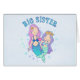 Tema da fantasia design com duas sereias bonitinhas, uma com cabelo rosa e outra com cabelo roxo segurando um coração com texto 'Irmã Grande'. Tem uma irmã design.
