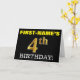Este design de cartão de saudação de aniversário apresenta uma mensagem como "PRIMEIRO NOME DO 4º ANIVERSÁRIO!", com o "4º" a ter uma aparência falsa/imitada de cor dourada. O nome do destinatário na frente pode ser personalizado e o fundo frontal é preto colorido. Também apresenta uma mensagem de saudação de aniversário personalizada no dentro. Um cartão de aniversário como este talvez pudesse ser dado a alguém em comemoração do seu quarto aniversário. [~Z0000183]